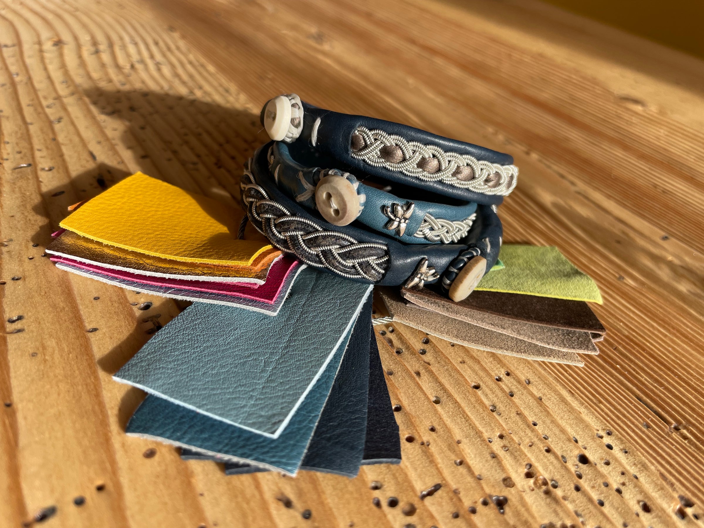 We take great care to offer a wide selection of exquisite leather colours to suit every taste and style. Our main focus is on naturally dyed leather, which has a timeless and natural look. These colours beautifully capture the essence of Sámi nature and give your piece a more authentic style. For those looking for more vibrant colours, we also offer a selection of bright, colourful shades, combining tradition with modern individuality. Discover our diverse colour palette, from the rustic beauty of naturally tanned leather to vibrant, less traditional options that add a fresh and exciting dimension to your style. To ensure that you can enjoy your handmade piece for as long as possible and see how it develops its own unique patina, wear it with care and pride. Please note that water and sweat attack the leather and make it brittle. If you take it off when exercising, showering and swimming, you will protect the precious reindeer leather from hardening. A splash of water here and there will not harm it, however. Just make sure it does not become soggy. The spun pewter and silver thread requires minimal care. Over time, it will flatten and develop its own individual patina, making your piece even more precious.